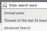 Im Kopfbereich jeder Seite findest du ein Suchfeld, dessen Funktion sich dynamisch der gerade angezeigten Seite anpasst. Du durchsuchst immer den aktuellen Bereich, in dem du dich gerade befindest. Benutzt du also die Suchfunktion während du in einem Thema liest, so wird nur das Thema durchsucht, willst du das gesamte Forum durchsuchen, musst du also deine Suche auf der Startseite beginnen. Wenn du auf das Suchicon klickst, öffnet sich ein Dropdown-Menü mit häufig genutzten Suchanfragen. Außerdem enthält es auch den Link zur Erweiterten Suche, welche viele zusätzliche Suchoptionen bietet.